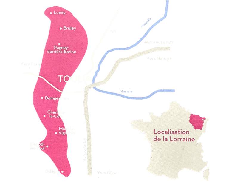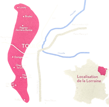 Implanté depuis l’époque romaine, le vignoble des Côtes de Toul regroupe 8 communes sur une bande de 20 km du nord au sud de Toul.